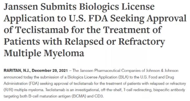 12月29日,强生宣布,旗下公司杨森已向美国FDA递交BCMA/CD3双特异性抗体teclistamab治疗复发或难治性多发性骨髓瘤(r/r MM)的生物制品许可申请(BLA)。teclistamab有望成为全球首个获批的BCMA/CD3双抗。