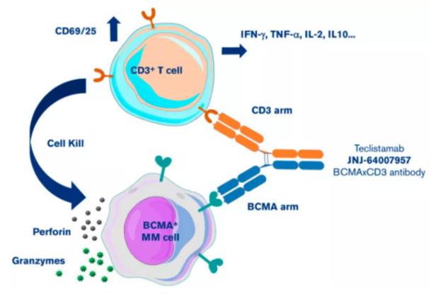 BCMA是肿瘤坏死因子受体(TNF)超家族成员,在MM患者癌细胞中高表达,CD3参与激活免疫系统抵抗感染。teclistamab是一款使用Genmab DuoBody®技术开发的能同时靶向T细胞CD3和MM细胞BCMA的IgG4双抗,其可将CD3+T细胞重新定向到表达BCMA的骨髓瘤细胞,以诱导针对靶细胞的细胞毒作用。teclistamab曾获FDA授予的突破性疗法资格。
