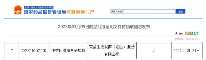 1 月 5 日,NMPA 官网显示,荣昌生物 ADC 产品维迪西妥单抗的新适应症获批上市,用于既往接受过系统化疗且 HER2 表达为免疫组化检查结果为 2+ 或 3+ 的局部晚期或转移性尿路上皮癌的患者。这项新适应症于 2021 年 7 月 14 日申报上市,同年 9 月被纳入优先审评审批,历时近 6 个月获批。点此回顾受理号审评历程