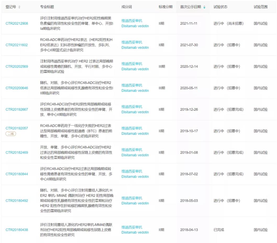 维迪西妥单抗在国内登记的 II 期及 III 期临床试验