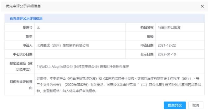 1 月 10 日,CDE 官网显示,北海康成罕见病用药「马昔巴特口服液」申报上市,拟纳入优先审评,用于 1 岁及以上 Alagille 综合征(阿拉杰里综合征,ALGS)患者胆汁淤积性瘙痒。