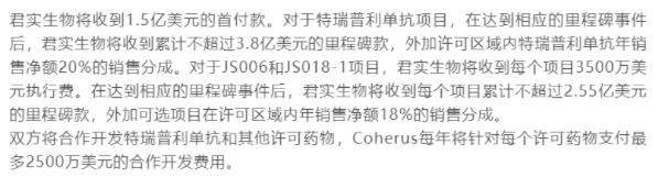 1月11日,君实生物宣布,Coherus已启动行使TIGIT单抗JS006在美国和加拿大的许可选择权的程序。同时,Coherus将向君实生物支付3500万美元首付款,最高达2.55亿美元的开发、申报和销售里程碑付款,以及产品销售净额18%的销售分成。