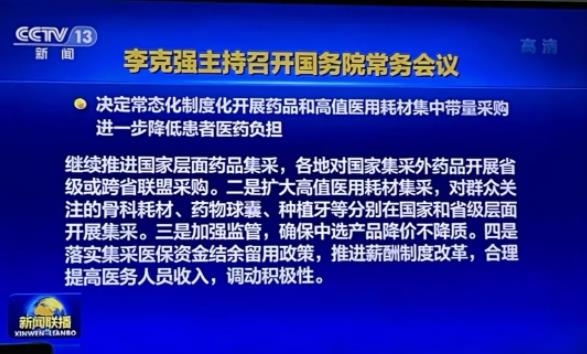 2022年1月10日,国务院总理李克强主持召开国务院常务会议,决定常态化制度化开展药品和高值医用耗材集中带量采购,进一步降低患者医药负担。