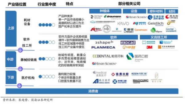 国海证券调研中指出,种植牙产业链跨度大,下游医院端费用占比大。实际上消费者支付钱更多流入了口腔医院(用于支付医师费用,市场推广费用,购买医疗设备、口腔医院盈利等),耗材费用实际占较低。经测算,消费者支付端看,种植体占比预计在10.4%,修复材料占比9.6%,牙冠占比3.5%。