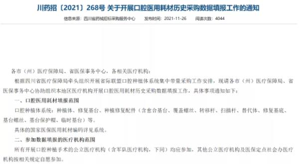 种植牙集采在一些地方上已经悄然开始推进。2021年11月18日,四川药械招标采购服务中心发布通知,开始采集口腔类高值医用耗材产品信息。范围涵盖口腔种植体系统所需的医用耗材,种植体、修复基台、种植修复配件等。11月26日,四川又下发了要求所有开展口腔种植手术的公立医疗机构填报数据的通知。