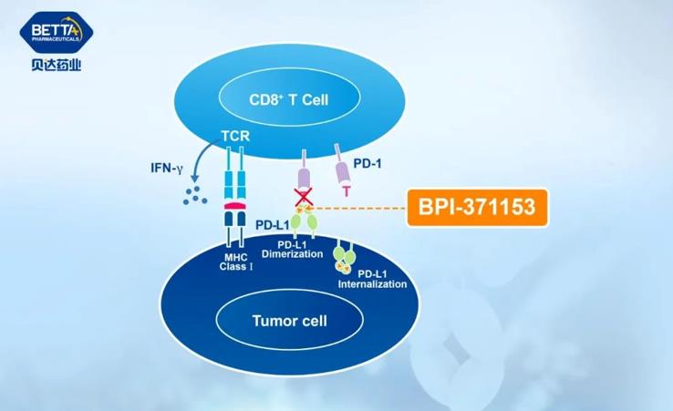 BPI-371153是由贝达药业自主研发的新分子实体化合物,属于新型强效、高选择性的口服小分子PD-L1抑制剂。临床前数据显示,BPI-371153可有效诱导和稳定PD-L1二聚体的形成及内吞,从而强有力地阻断PD-L1/PD-1相互作用,展现出了优秀的体外及体内活性、良好的安全性及药代动力学性质。