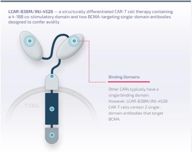 Cilta-cel由金斯瑞旗下子公司传奇生物自主研发,是一种结构差异化的CAR-T细胞疗法,包含一个4-1BB共刺激结构域和两个旨在提高亲和性的BCMA靶向单域抗体。