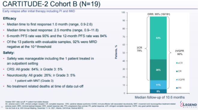 A队列和B队列的安全性与之前CARTITUDE-1报告的数据一致。队列A中95%的患者发生细胞因子释放综合征(CRS),B队列中84%的患者发生细胞因子释放综合征(CRS),主要为1/2级,中位发病时间为7-8天,中位持续时间约4天。