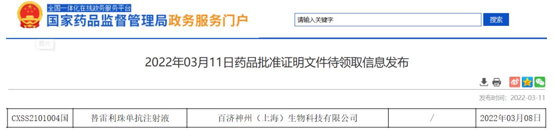 3月11日,国家药监局官网显示,百济神州PD-1替雷利珠单抗新适应症获批,用于治疗既往经治、局部晚期不可切除或转移性高度微卫星不稳定型(MSI-H)或错配修复缺陷型(dMMR)实体瘤患者。