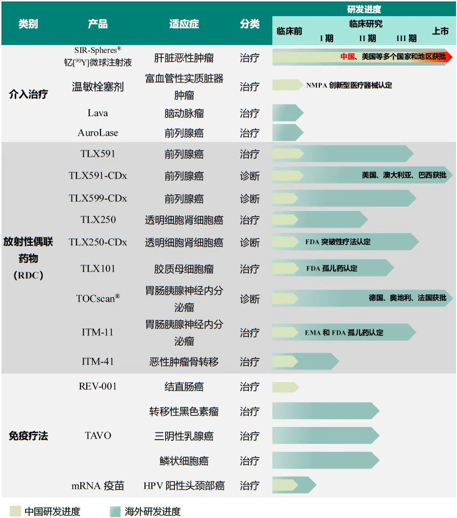 放射性核素药物诊疗平台是远大医药在抗肿瘤领域重点打造的高端技术平台,尤其是2021年以来,公司在放射性药物诊疗领域加速发力,其放射性药物诊疗平台现已有10款全球创新产品,管线丰富且癌种覆盖面广,涵盖诊断和治疗两类核素检测或治疗药物,适应症覆盖肝癌、前列腺癌、透明细胞肾细胞癌、胶质母细胞瘤、胃肠胰腺神经内分泌瘤及恶性肿瘤骨转移等,为患者提供多适应症治疗选择、多手段且诊疗一体化的全球领先的抗肿瘤方案。