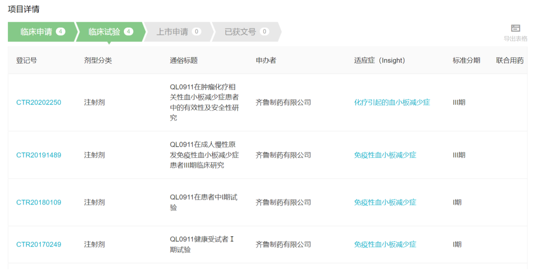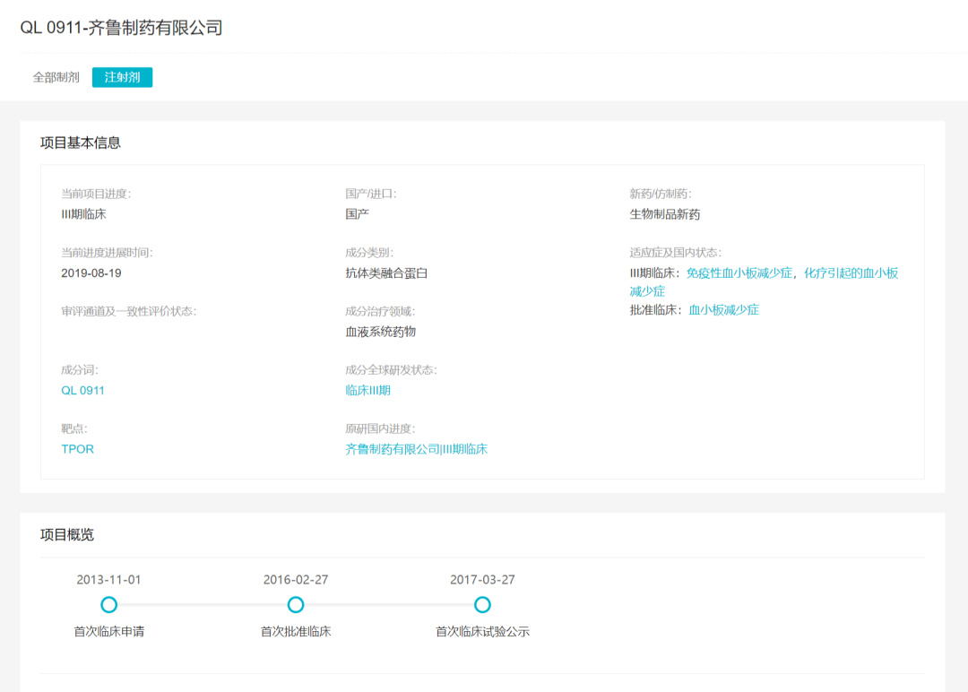 据 Insight 数据库,齐鲁制药的 QL0911(注射用重组人血小板生成素拟肽-Fc 融合蛋白)早在 2013 年就向 NMPA 提交了临床试验申请,历时多年临床开发。在国内,齐鲁共启动了 4 项临床试验,包括两项 III 期临床,分别针对成人慢性原发免疫性血小板减少症 和 肿瘤化疗相关性血小板减少症(点击相应适应症,可跳转至 Insight 临床试验详情页)。