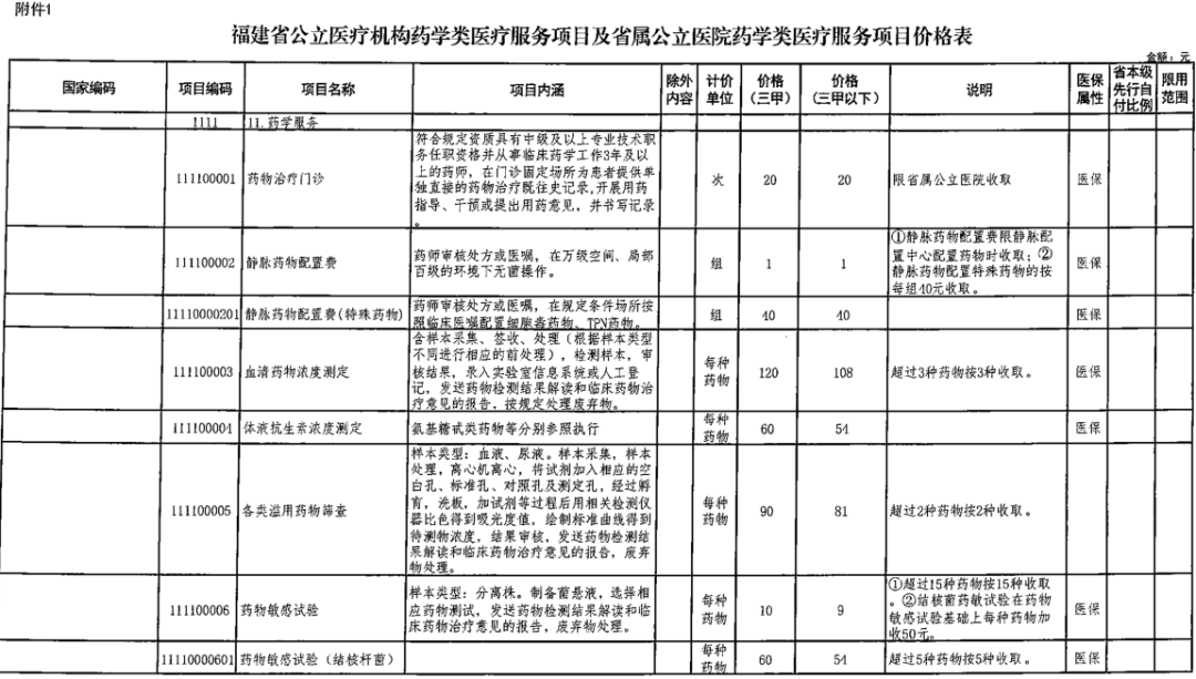 试行范围:药物治疗门诊、多学科综合门诊和住院诊查费“加收”规定,限省属公立医院为患者提供临床药物治疗等药学服务收取,但不包括中医中治。公立医疗机构提供血清药物浓度测定、各类滥用药物筛查、药物敏感试验、静脉药物配置费、用药指导的基因检测等药学服务按规定收取。