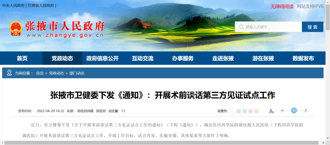 最近,甘肃省张掖市卫健委计划在河西学院附属张掖市人民医院开展术前谈话第三方见证试点。