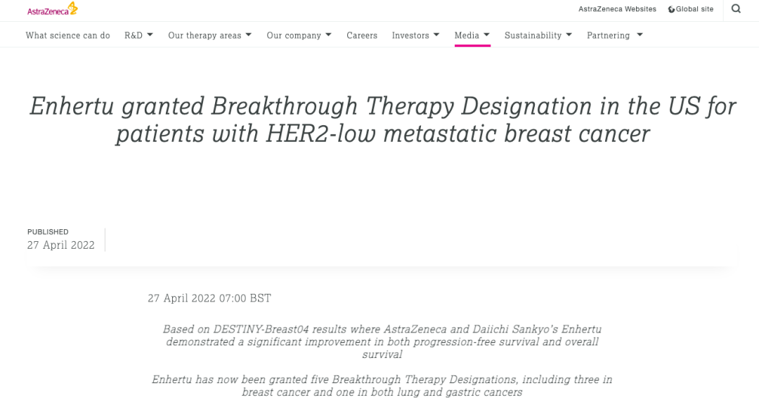 4 月 27 日,阿斯利康和第一三共共同宣布 HER2 ADC 药物 Enhertu 已获得 FDA 突破性疗法认定(BTD),用于既往接受过至少一种全身治疗后在辅助治疗六个月内复发或进展的 HER2 低表达(IHC 1+ or IHC 2+/ISH-阴性)不可切除或转移性乳腺癌患者。