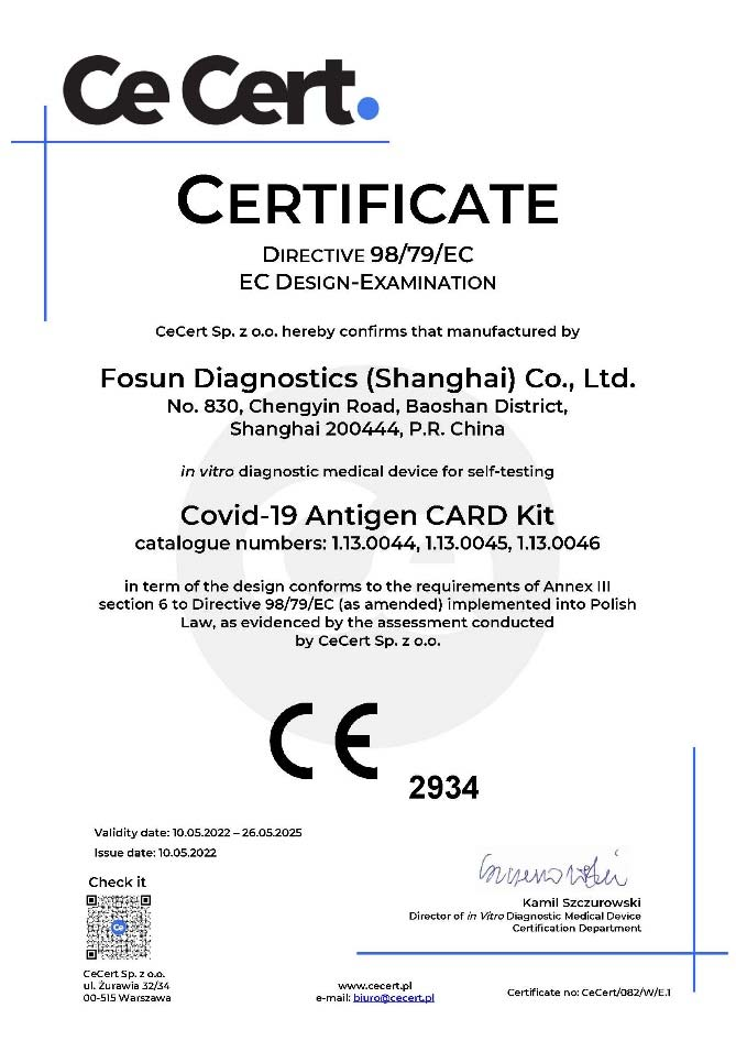 5月10日,复星诊断新型冠状病毒抗原自测试剂盒(Covid-19 Antigen CARD Kit)取得欧盟CE证书,标志着该自测试剂盒可在 27 个欧盟国家以及认可欧盟CE认证的国家进行销售。