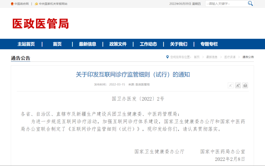 2022年6月9日,文件在国家卫健委官网发布,《关于印发互联网诊疗监管细则(试行)的通知》是由国家卫生健康委办公厅、国家中医药局办公室于2022年2月8日印发的。