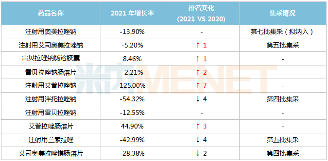 虽然质子泵抑制剂在售品种数不多,但大多数为销售超10亿的大品种,市场受集采影响较大。畅销品种注射用泮托拉唑钠被纳入第四批集采,其销售额由2020年的超40亿元下滑至2021年的近20亿元,降幅超过50%,排名下降4个位次。