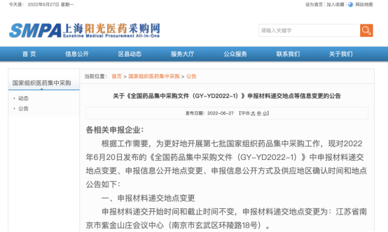 6月27日,上海联合采购办公室发布关于《全国药品集中采购文件(GY-YD2022-1)》申报材料递交地点等信息变更的公告。