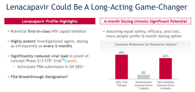 不难想象,一旦Lenacapavir获批在美国上市,将和Cabenuva在HIV市场展开正面竞争。当然,为应对原有产品的专利到期等问题,吉利德的HIV业务并非单单押注Lenacapavir一个剂型。