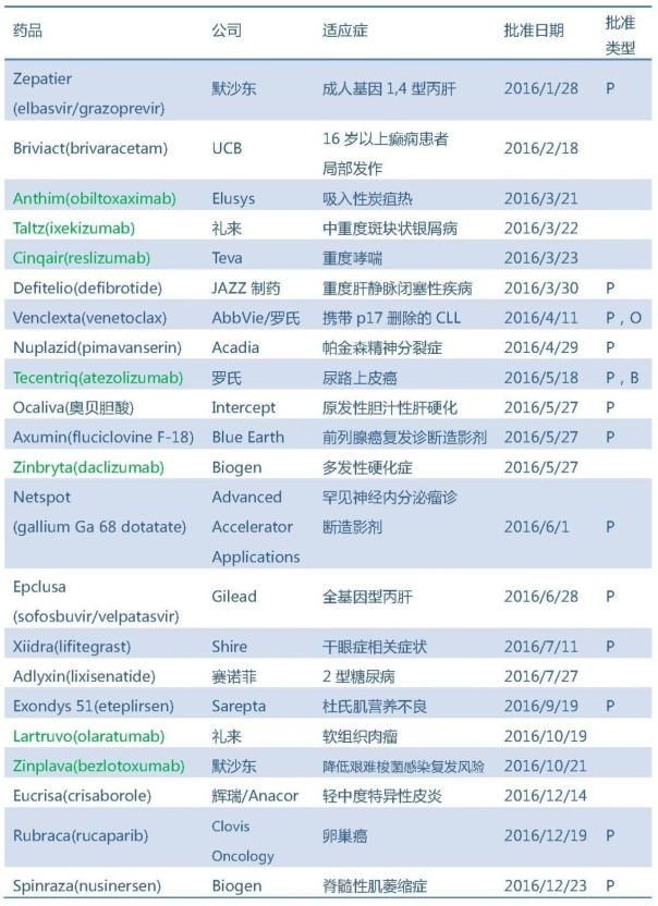 2016年FDA共批准22个原创新药,包括15个新分子实体和7个新生物制品,其中15个以优先审评(P)的方式获得批准。从企业角度看,罗氏、默沙东、礼来、Biogen均有2个新药获批。