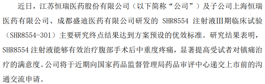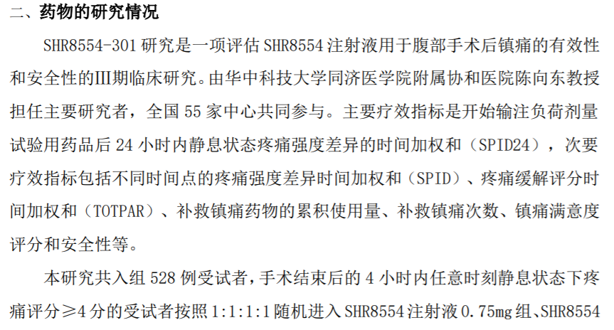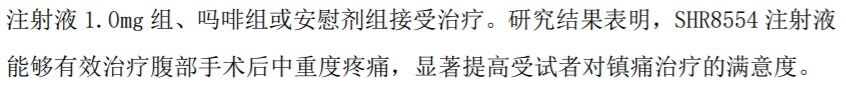SHR8554三期临床共入组528例受试者,用于腹部手术后的镇痛,对照组为吗啡组和安慰剂组,结果表明SHR8554能够有效治疗腹部手术后中重度疼痛,显著提高受试者对镇痛治疗的满意度。