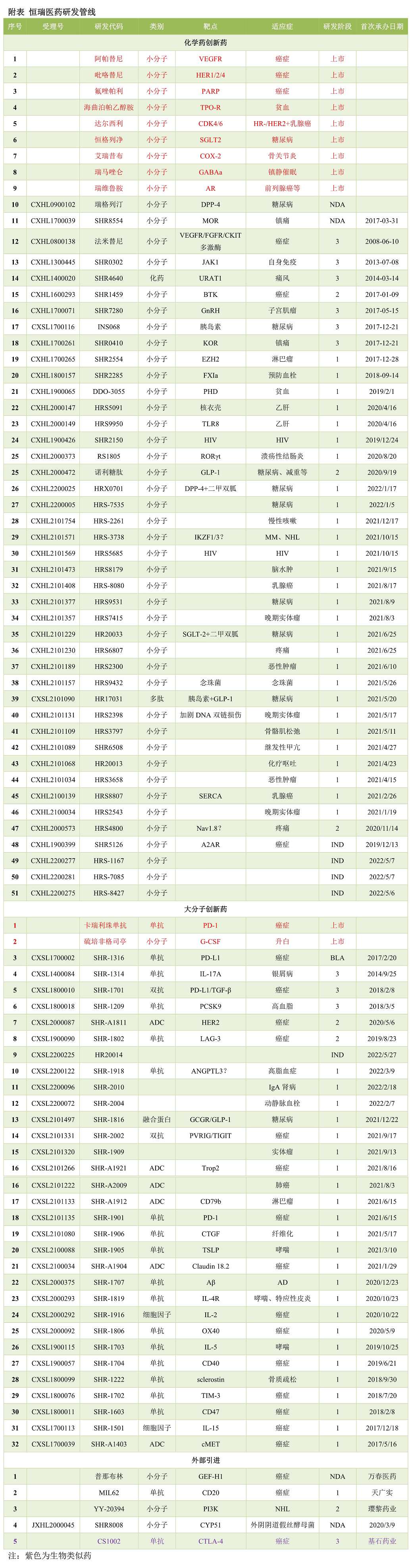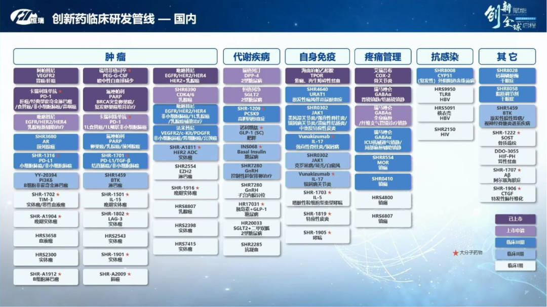 恒瑞医药的创新药布局已经形成强大管线梯队,在肿瘤、代谢、自免、疼痛管理、抗感染等多个领域陆续开花结果。恒瑞医药已经有11款一类新药上市,另有2款小分子新药和1款大分子新药申报上市,未来几年将更多新药陆续进入商业化阶段。
