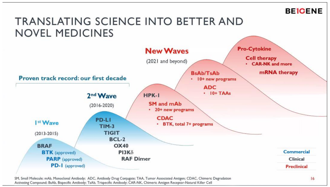 2021年开始,推出更多大/小分子药物以及新的药物形式,包括双抗/多抗、CDAC(PROTAC)、CAR-NK、mRNA等,将不断有更多产品推进到临床阶段。