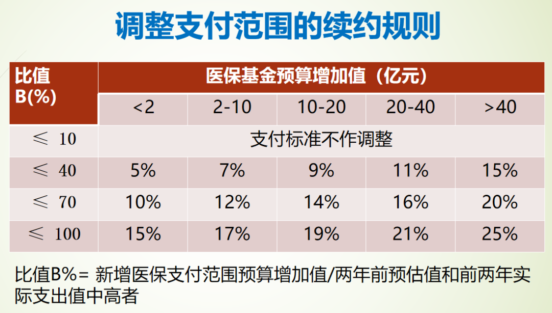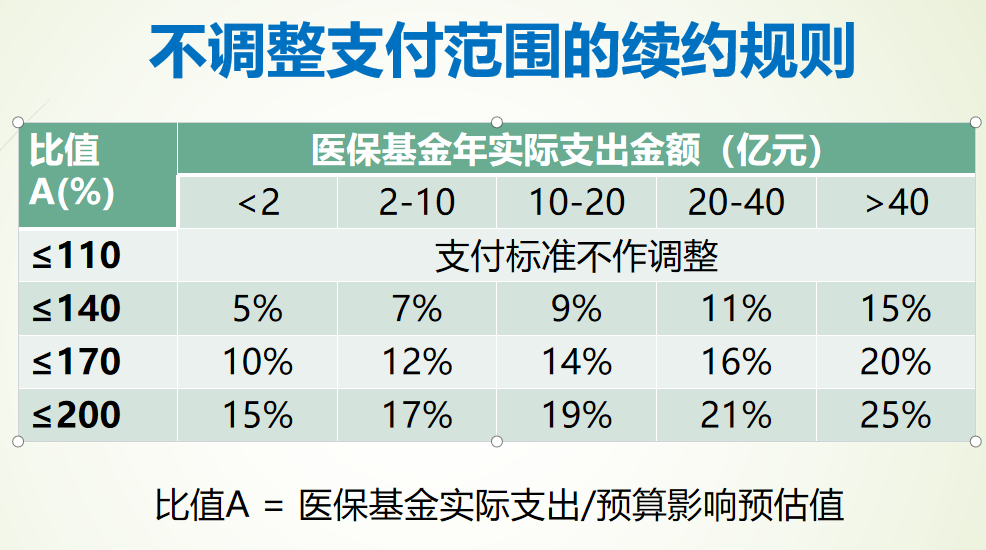 过去,针对独家药品,医保部门提出根据两个指标完成续约,即预算影响预估值和实际支出。比如,某药品进入目录后,医保会对其对基金预算的影响进行预估,假设销售金额为5亿元。协议执行2年后,该药品销售10亿元。按照销售量越大,续约时价格越要下降的原则,实际支出大于预算一定百分比,续约时支付标准要相应下降一定比例,支出金额越多,超出预算越多,降价幅度越大。