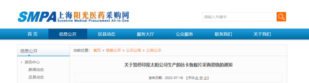 2022年7月,上海阳光医药采购网发布通告,暂停第五批集采中选产品印度太阳公司生产的比卡鲁胺片采购资格的通知。原因是其部分批次产品“干燥失重”项目因不符合进口药品注册标准。