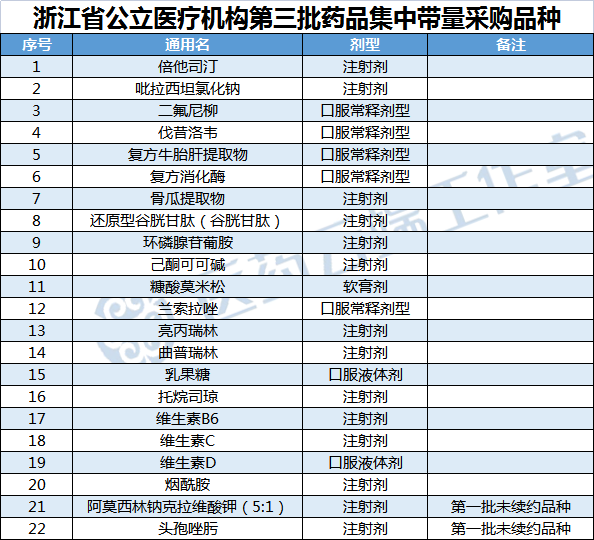 从公布的品种来看,浙江省第三批集采共涉及22个品种,其中包括阿莫西林钠克拉维酸钾(5:1)、头孢唑肟两个第一批未续约品种。而此前业内流传的生物制剂和中成药并未出现在此次报量名单中。