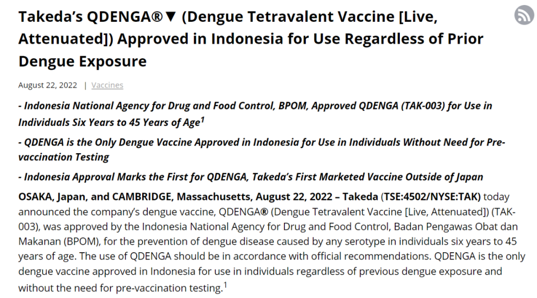 8月22日,武田宣布,登革热疫苗QDENGA(TAK-003)获印度尼西亚国家食品药品监督管理局(BPOM)批准(全球首次批准),用于预防6至45岁因任何血清型引起的登革热疾病。这是BPOM批准的唯一一种用于个人的登革热疫苗,无论以前是否感染过登革热,也无需进行接种前检测。