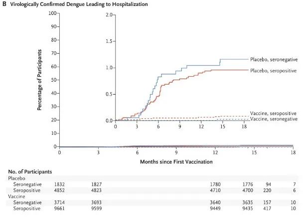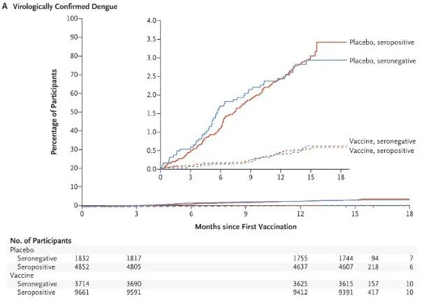 结果显示,在12个月的随访中,达到了其对病毒学证实的登革热的总体疗效的主要终点,总体疗效为80.2%。在18个月的随访中,该试验也达到了所有次要终点,预防因登革热住院的发生率为90.4%。第二剂接种四年半后,TAK-003对病毒学证实的登革热的疗效为61.2%,对登革热住院治疗的疗效为84.1%。接种疫苗三年后,该疫苗的疗效为62%,使登革热住院率下降了83.6%。迄今为止,TAK-003的耐受性良好,且没有发现重要的安全风险。