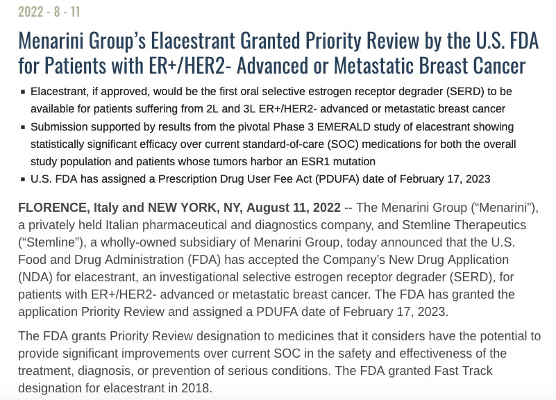 药融云数据,www.pharnexcloud.com显示:美纳里尼集团/Stemline Therapeutics引进的SERD新药,近期美国FDA已接受公司关于口服艾拉司群(elacestrant)的新药上市申请(New Drug Application),用于ER+/HER2-晚期或转移性乳腺癌患者。FDA已批准该申请获优先审评,并指定2023年2月17日为PDUFA日期。此次NDA提交基于先前于2021年10月20日公布的EMERALD研究3期积极数据。与氟维司群(Fulvestrant)或芳香化酶抑制剂选项的标准治疗方案(SoC)相比,EMERALD均达到了它的两个主要终点:总体人群中的无进展生存期(PFS)和雌激素受体1(ESR1)突变亚组中的无进展生存期。