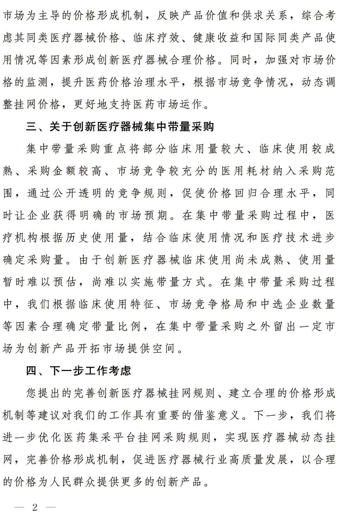 《答复》指出,在集中带量采购过程中,医疗机构根据历史使用量,结合临床使用情况和医疗技术进步确定采购量。由于创新医疗器械临床使用尚未成熟、使用量暂时难以预估,尚难以实施带量方式。在集中带量采购过程中,根据临床使用特征、市场竞争格局和中选企业数量等因素合理确定带量比例,在集中带量采购之外留出一定市场为创新产品开拓市场提供空间。