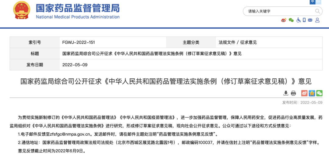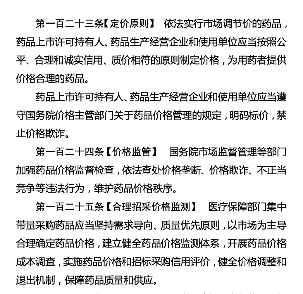 今年5月,国家药监局发布的《中华人民共和国药品管理法实施条例(修订草案征求意见稿)》第123至125条提到的“定价原则”、“价格监管”、“合理招采价格监测”中明确,“建立健全药品价格监测体系,开展药品价格成本调查,实施药品价格和招采信用评价,健全价格调整和退出机制,保障药品质量和供应。”