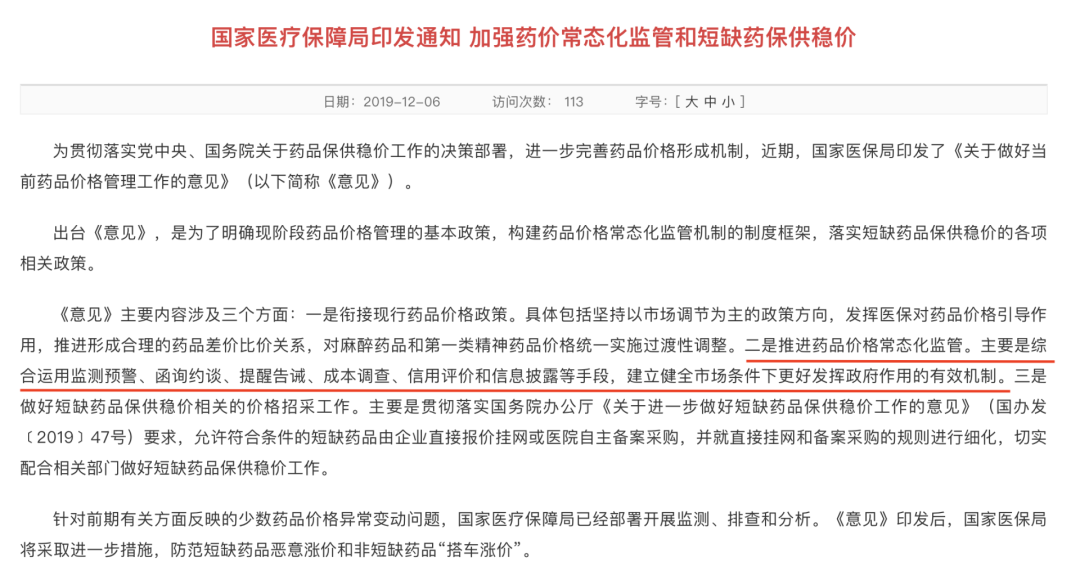 例如,2019年12月,国家医保局发布的《关于做好当前药品价格管理工作的意见》中,要完善药品价格成本调查工作机制。