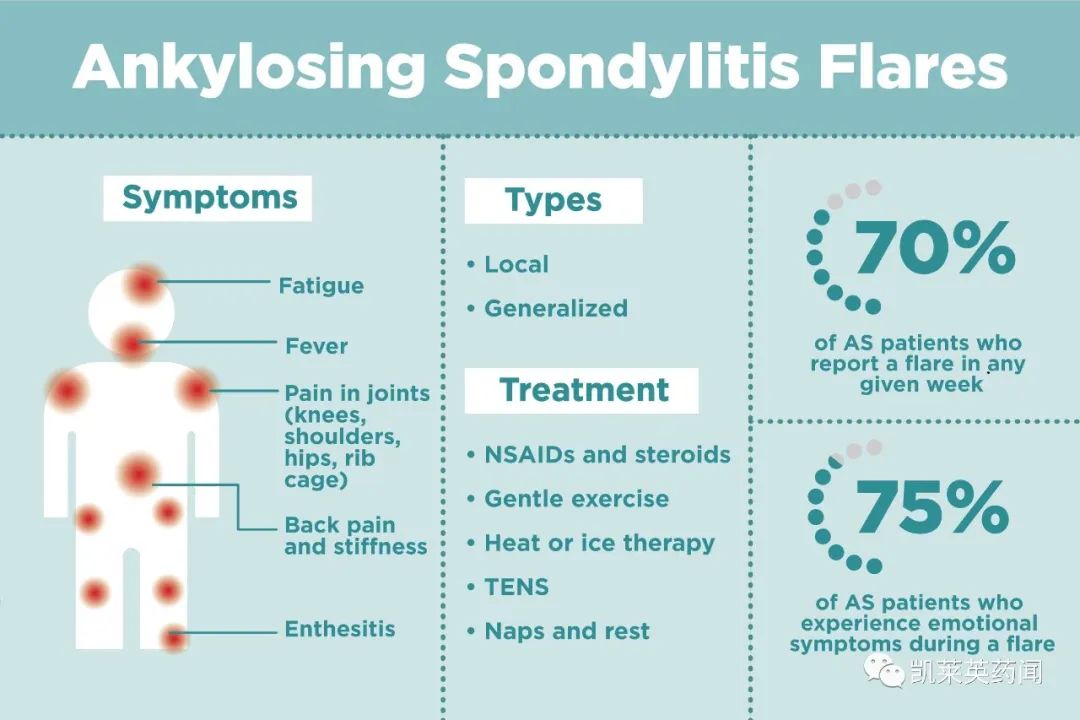目前,AS的发病机制尚未完全明确,普遍认为是遗传、感染、环境以及免疫等多个因素综合作用的结果。AS尚无根治方法,其治疗目标是缓解疼痛、僵硬和疲劳,同时维持良好的姿势以及良好的生理和心理功能。药物治疗主要包括非甾体类抗炎药、改善病情抗风湿药、糖皮质激素、生物制剂类药物(肿瘤坏死因子α抑制剂和IL-17抑制剂)或JAK抑制剂类小分子药物。其中,目前在国内仅有一款JAK抑制剂类药物(托法替布)于今年4月获得NMPA批准上市。