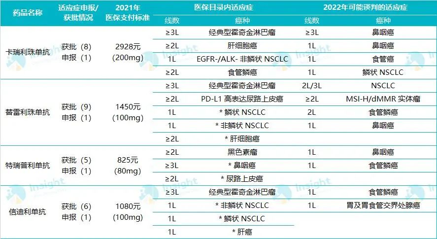 据 Insight 统计,本轮国家医保谈判新增和续谈的四款目录内 PD-1 单抗中,恒瑞的卡瑞利珠单抗将有 8 个适应症参与,包括新增晚期肺鳞癌和一线食管鳞癌在内的 4 个适应症;信达的信迪利单抗将有 6 个适应症参与,包括新增的晚期食管癌和一线晚期胃癌适应症;百济神州的替雷利珠单抗将有 9 个适应症参与,包括新增的唯一国产获批的二线后治疗晚期 NSCLC 在内的 4 个适应症;君实生物的特瑞普利单抗将有 4 个适应症参与,包括新增的 2 个适应症。