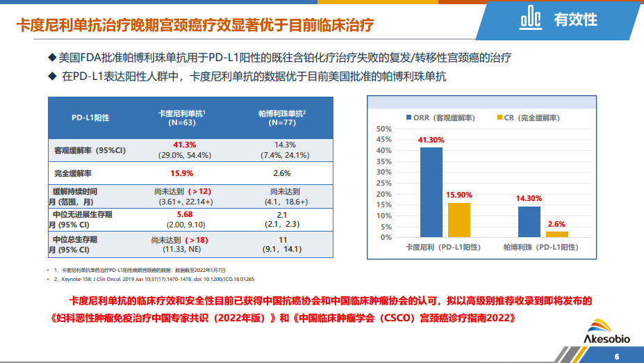 在疗效上,尽管非头对头数据参考意义有限,卡度尼利单抗在单药和联合疗法的疗效数据上都表现出优于帕博利珠单抗的结果。同时基于在中国患者中的临床证据,该药获批上市之后,成为医生和患者首选晚期宫颈癌肿瘤免疫治疗药物,填补了中国晚期宫颈癌的免疫药物治疗的空白。