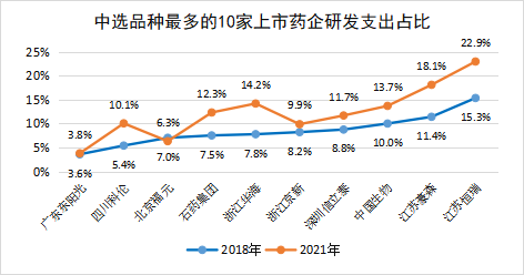 图3 中选品种最多的10家上市药企研发支出占比变化
