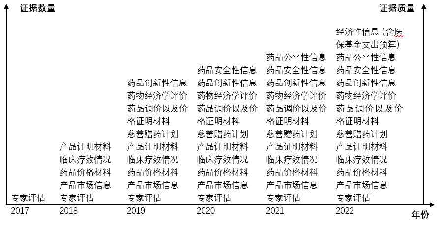 可以很明显看出,这一时期医保药品目录相关的决策支持不再仅限于专家经验,而是开始综合考量客观数据、科学证据、以及专家意见等多维度的证据支持决策。虽然对客观证据和评估数据的要求还不够全面,但这一时期对于医保药品目录向更加循证、科学、合理的发展起到了关键性的过渡作用。