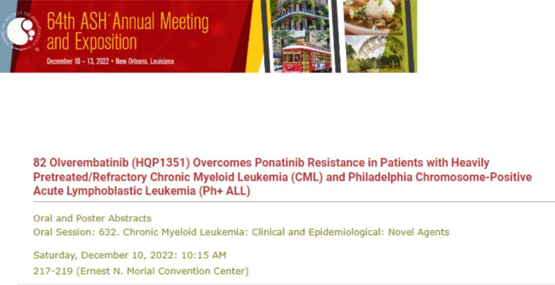 奥雷巴替尼(HQP1351)可克服既往接受过深度治疗/难治性慢性髓细胞白血病(CML)和费城染色体阳性急性淋巴细胞白血病(Ph+ ALL)患者对于Ponatinib的耐药