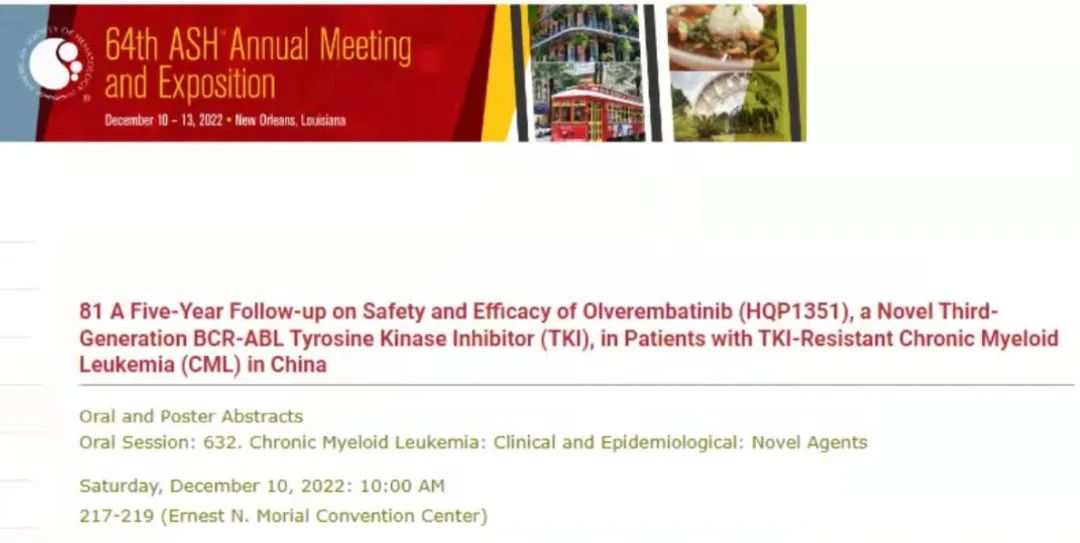 今年,亚盛医药核心品种、首个商业化产品、原创1类新药奥雷巴替尼(商品名:耐立克®)共有3项临床进展获选年会口头报告。这是该品种的临床进展连续第五年入选ASH年会口头报告,五连冠的佳绩充分体现国际血液学界对其疗效和安全性的认可。
