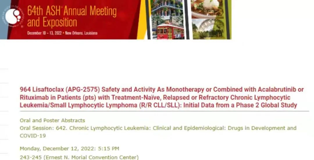 Lisaftoclax(APG-2575)单药或与Acalabrutinib/利妥昔单抗联合治疗在初治、复发或难治的慢性淋巴细胞白血病/小淋巴细胞淋巴瘤(R/R CLL/SLL)患者中的安全性和抗肿瘤活性:来自一项II期全球性临床研究的初步数据