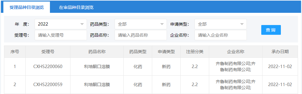 11 月 2 日,CDE 官网显示,齐鲁制药的 2.2 类改良型新药「利培酮口溶膜」申报上市。利培酮是一款针对精神分裂症或双相情感障碍开发的药物,对于此类精神科疾病而言,口溶膜剂对依从性的改善有望带来更多临床优势。