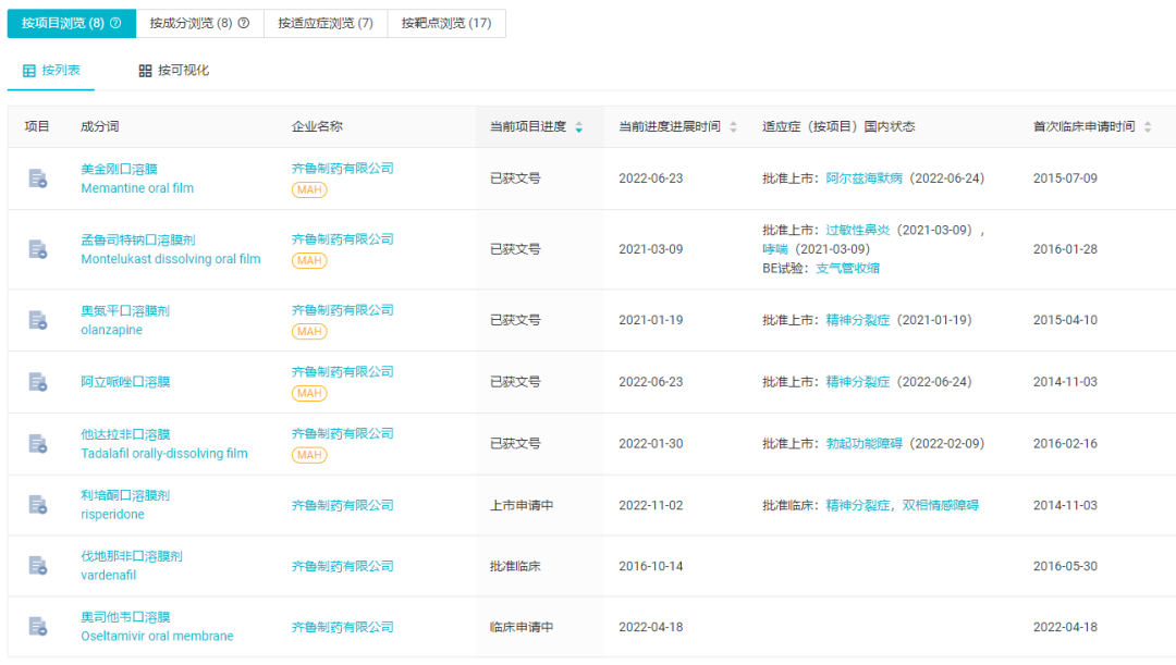 齐鲁制药的 8 款口溶膜改良型新药