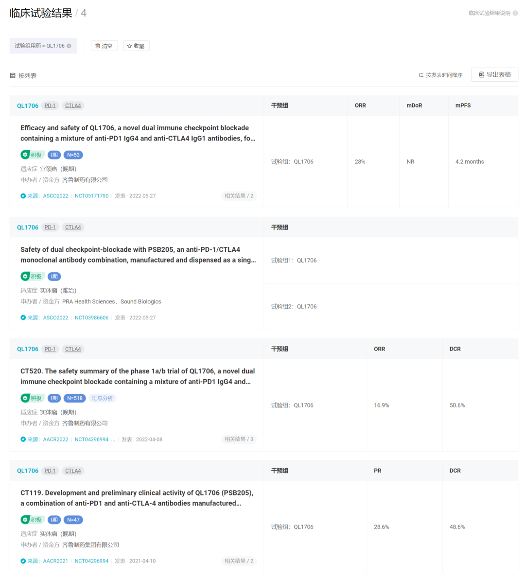 Insight 数据库收录了 QL1706 的 4 项临床结果,自 2021AACR 至 2022ASCO,均为早期数据。其技术优势能否转化为最终的临床优势,还要看后续临床结果的持续读出。