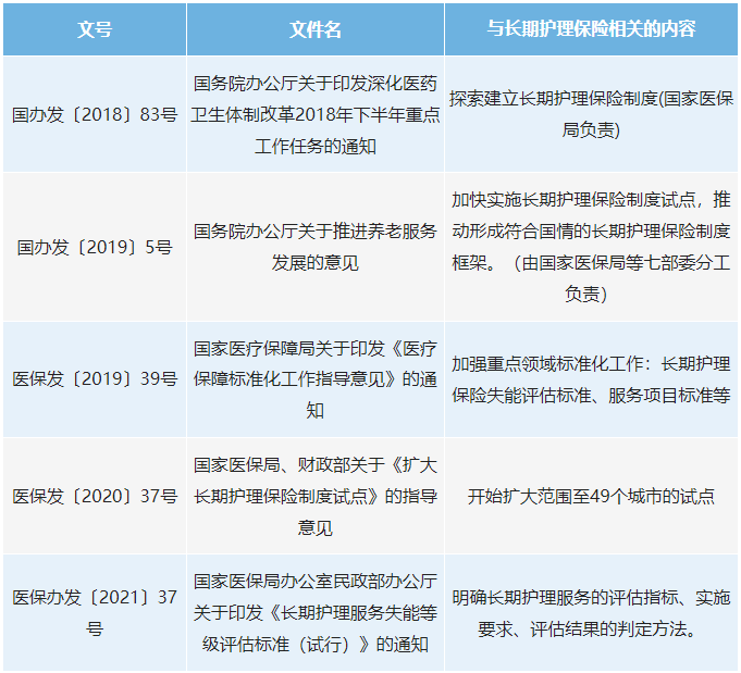 2016 年,人力资源社会保障部办公厅《关于开展 LTCI 制度试点的指导意见》(人社厅发〔2016〕80 号文)开启了长护险首批试点。该文明确了长期护理保险试点的社会保险属性,更对于筹资、管理、服务、保障等进行了明确的指导。这是我国长护险制度发展的里程碑。在政策的指引下,各地试点顺序展开,并被反复研究。国家各部委同期推出了一系列配套文件以保障制度的顺利推进,在此不一一列举。2018年国家医保局成立后,长期护理保险制度的得以更快推进,相关政策文件密集发布。(见表1)