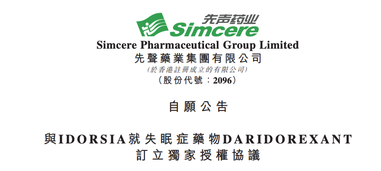 11 月 16 日,先声药业宣布已与 Idosia 就失眠药物 Daridorexant 签订独家授权协议。根据该协议,先声药业将获授 Daridorexant 在大中华地区的开发及商业化的独家权利。