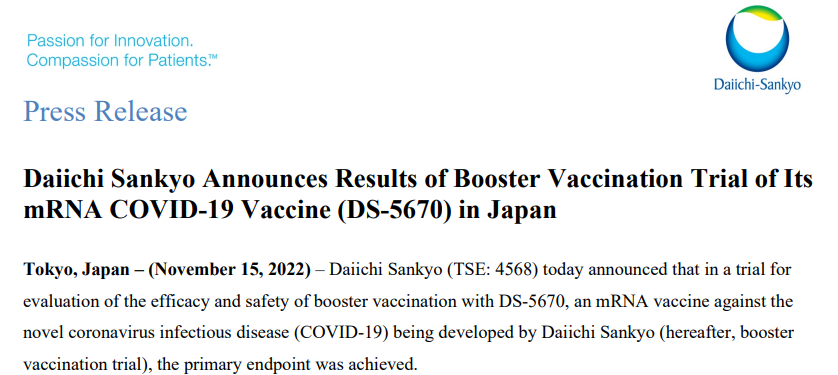 11月15日,第一三共宣布,其开发的新冠病毒mRNA疫苗DS-5670作为加强针接种的有效性和安全性评估试验达到主要终点。